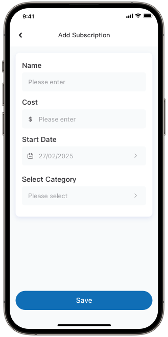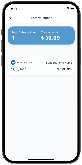 Just enter the app/platform name, amount, subscription date, and select the subscription type to quickly add your subscriptions.